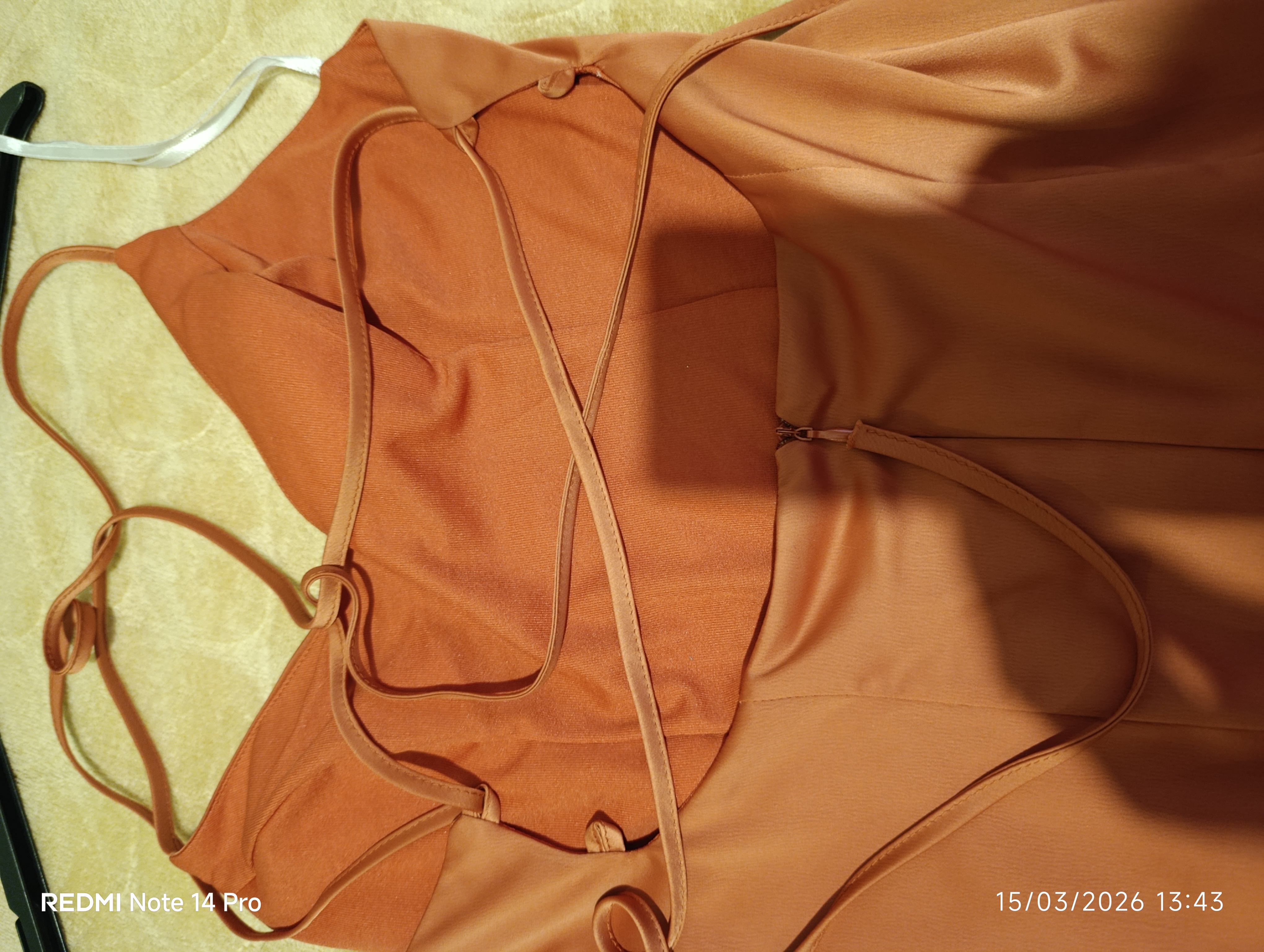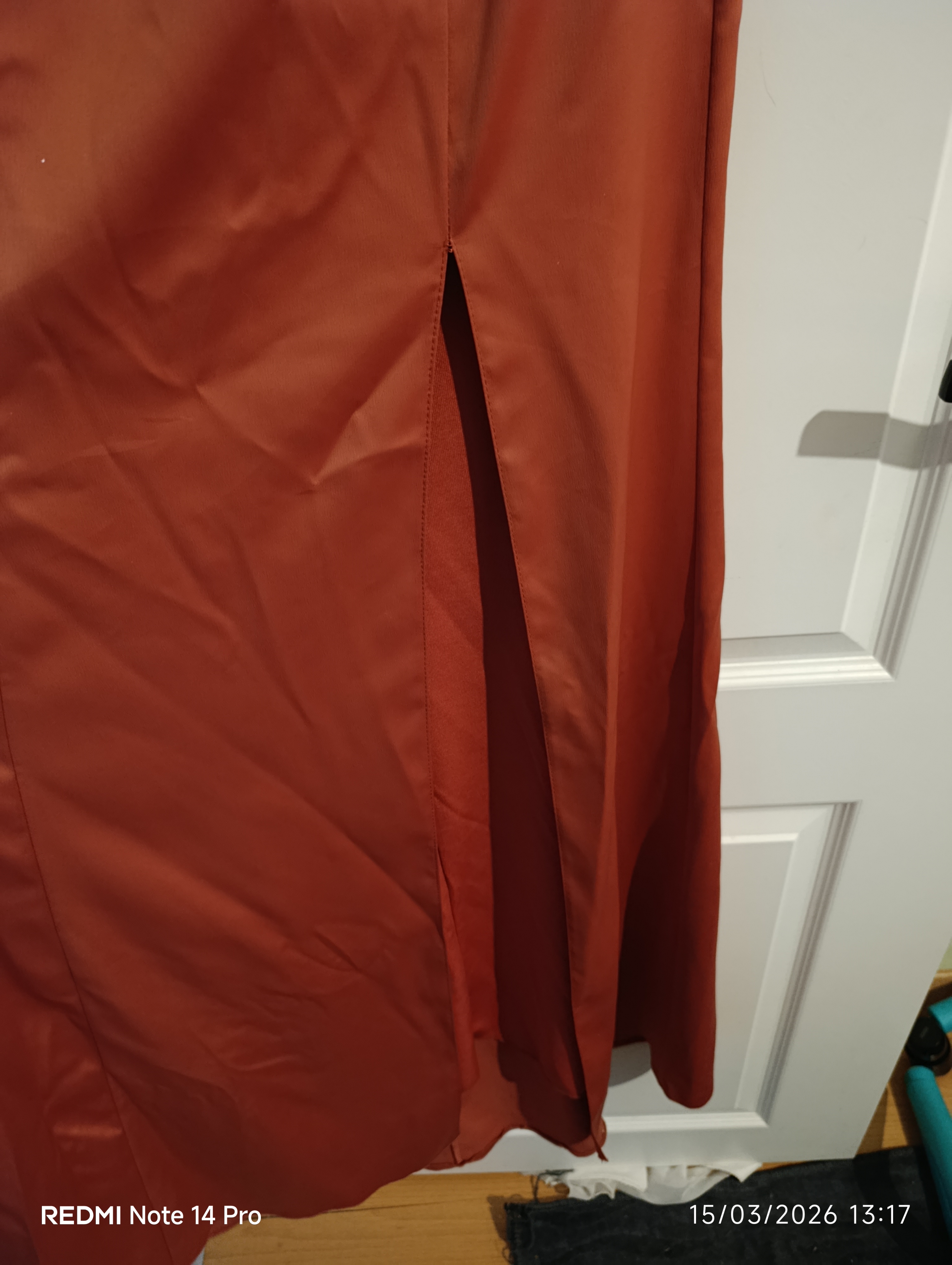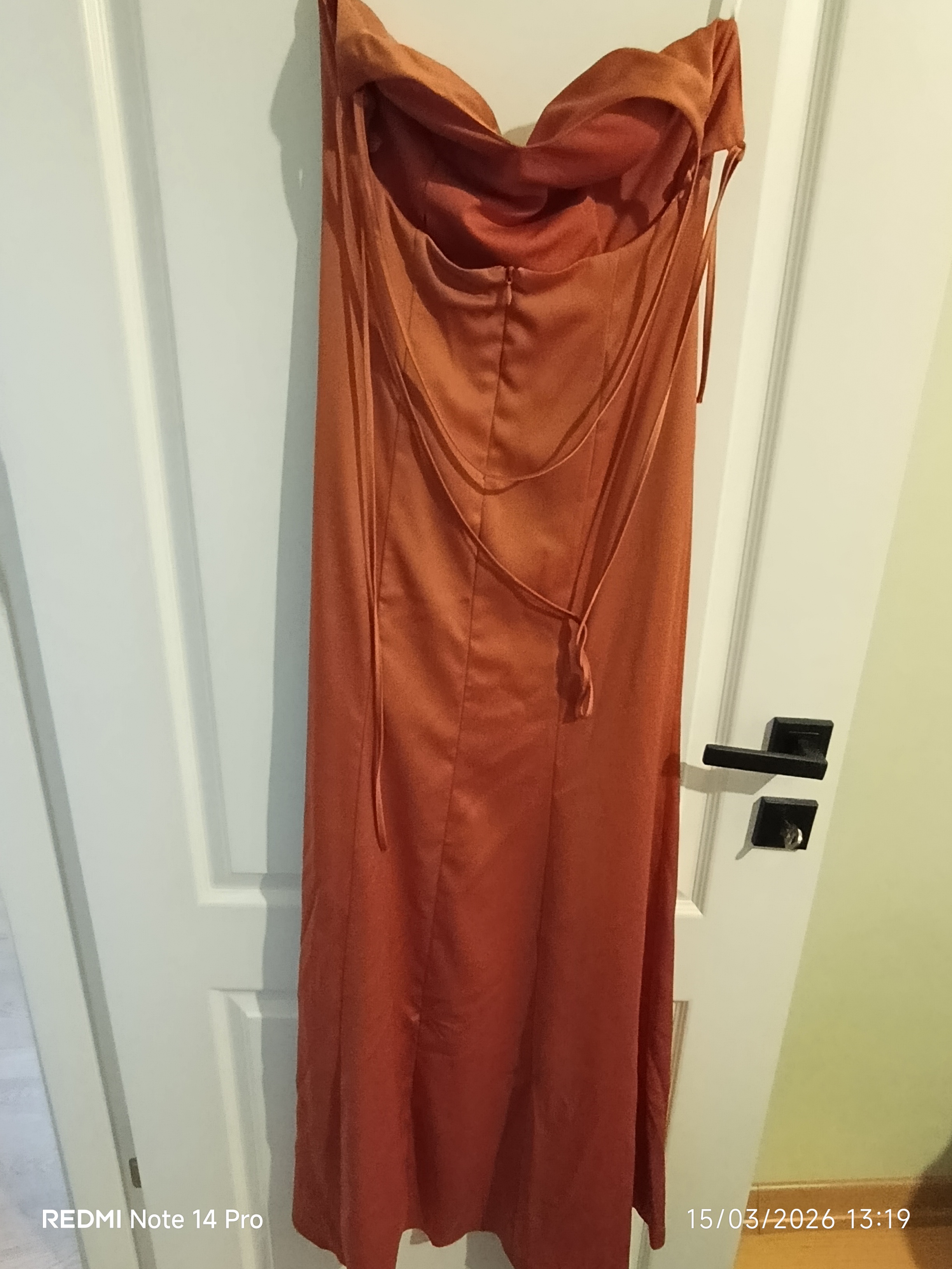 Bir kez giyilmiş olup tarçın renginde , yırtmaçlı elbise. Ürünü gardropta elbisenin boyu uzun olduğu için alttan toplayıp astigimdan dolayı kırışık görünebilir.