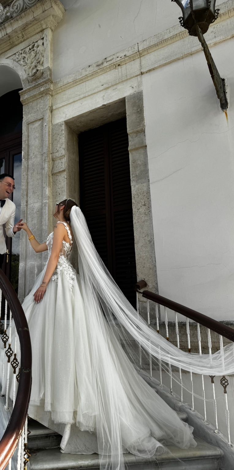 3638 beden uyumlu arkası bağcıklıdır.1 kere kullanıldı nikah ve çekim toplam 4 saat giyildi.2 farklı boy tarlatan duvak ve tül eldiveniyle verilecektir.Ufak yırtıkları olmuştu, onarıldı.Ölçüler farazi