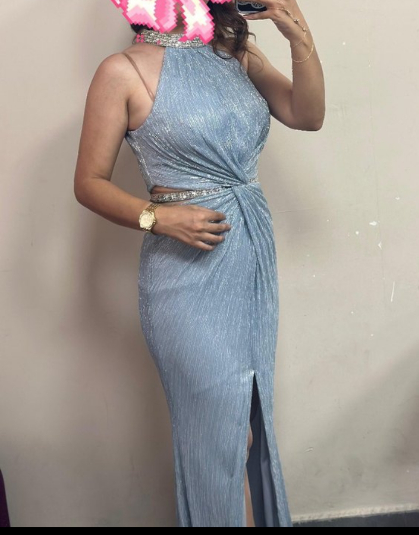 Işıltılı Buz Mavisi Taşlı Halter Yaka Abiye