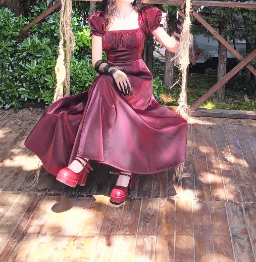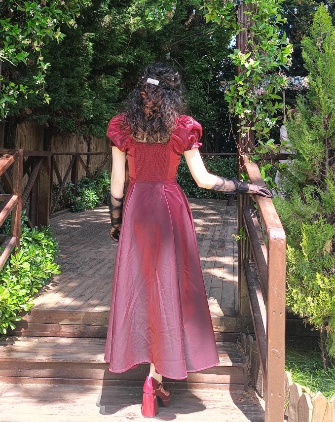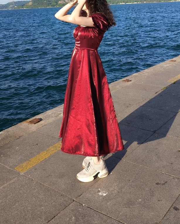 Sadece 1 kere düğünde giyildi, beli daraltıltı ama tekrar düzeltilebilir. Kumaşı satenimsi yanar döner bordo-kırmızı renk. Fransız balolarındaki elbiseler gibi çok şık duruyor.
